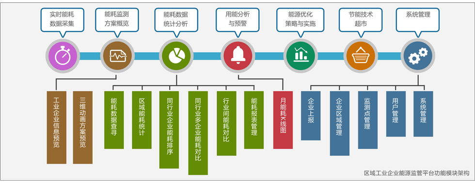 区域工业企业能源监管平台通过各种计量表具实现对多种能耗(如水、电、热等)的分类计量,同时利用物联网数据采集器实时传输能耗数据,从而更精确地获取企业能效实绩,直观地对企业产品和关键工序的能源数据进行实时监控,协助能源计划人员有效组织生产计划安排,科学合理及时调配能源,为企业提供从设备节能到控制节能再到管理节能的一体化节能技术解决方案。同时利用数学模型对能源使用情况预测和预警,使用数据挖掘等理论方法和技术对数据进行深入的加工处理和分析,以提高监控数据的应用水平。