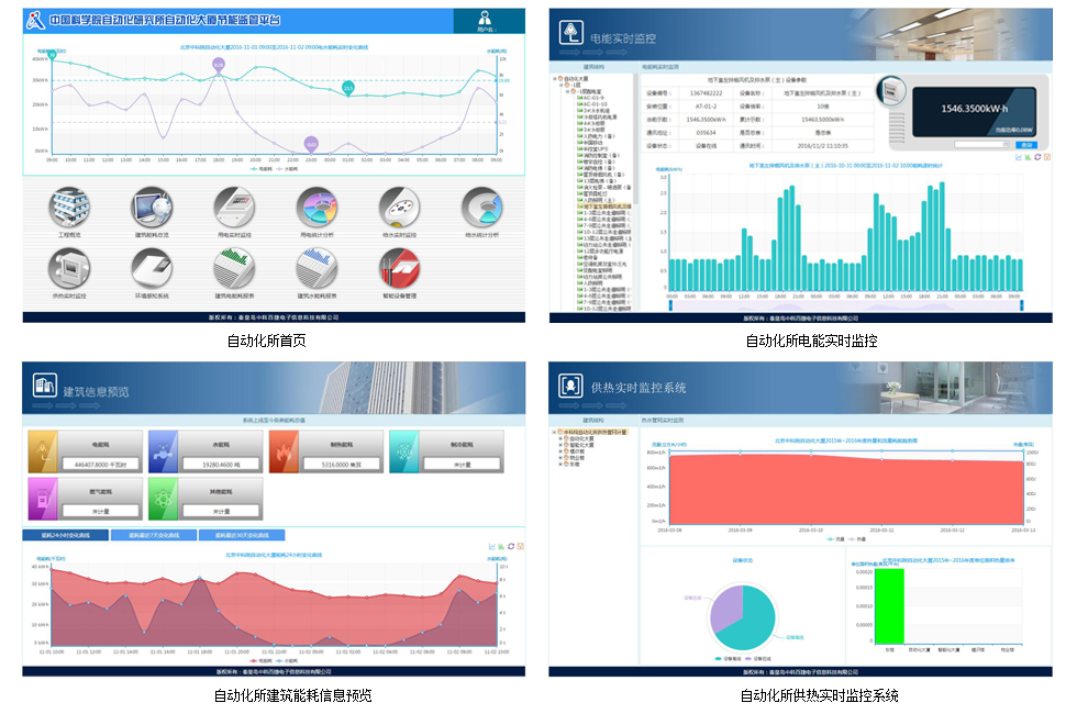 "中国科学院自动化研究所中科院自动化所节能监管平台”包括电能计量监管子系统、给水管网监管子系统、热水管网监管子系统和环境感知与预警子系统。系统设计电能计量点875个、水计量点5个、热计量点6个和环境监测点48个,基于物联网和互联网技术,通过在建筑中安装智能电表、智能水表、建筑能效前端控制等智能传感设备,实现对建筑能耗的分户分项计量、主要耗能设备的能源在线监测、建筑环境的实时在线监测,同时利用物联网数据采集器实时传输能耗数据和环境信息数据,并采用高效数据挖掘算法动态分析用户日常耗能模式,及时发现异常耗能行为,辅助用户制定详细的节能策略,节省能耗支出。系统不但能够为管理者提供决策支持服务,而且能够为故障检修争取时间并最大限度地减少浪费,提供资源利用效率,实现物业管理的信息化、智能化和现代化。